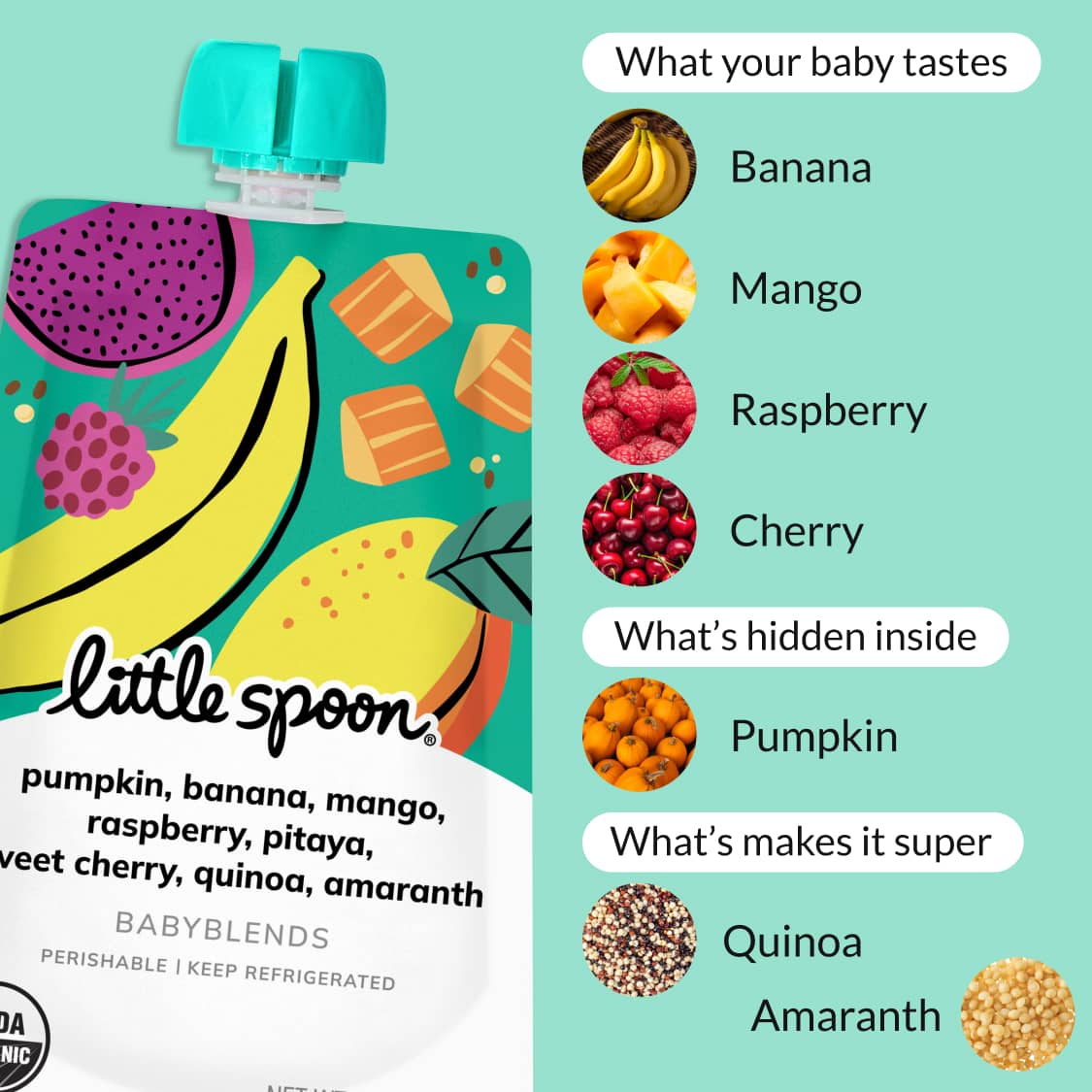 Pumpkin*, Banana*, Mango*, Raspberry*, Pitaya*, Cherry*, Quinoa Flakes*, Amaranth Flour*, Water.