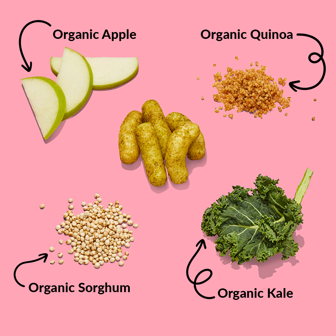 Puff* (Yellow Corn Meal*, Sprouted White Quinoa Flour*, Sorghum Flour*), Avocado Oil*, Apple Powder*, Kale Powder*.