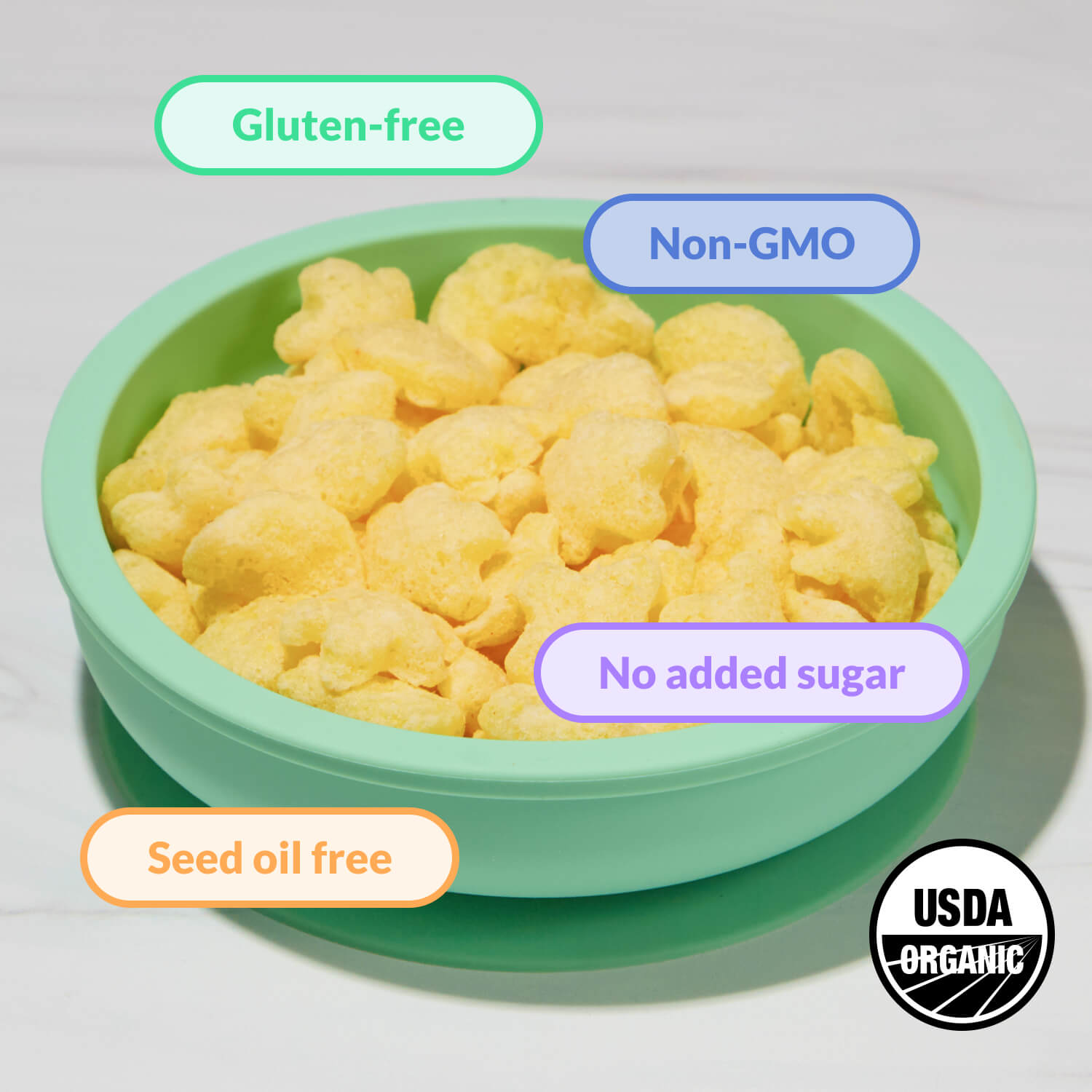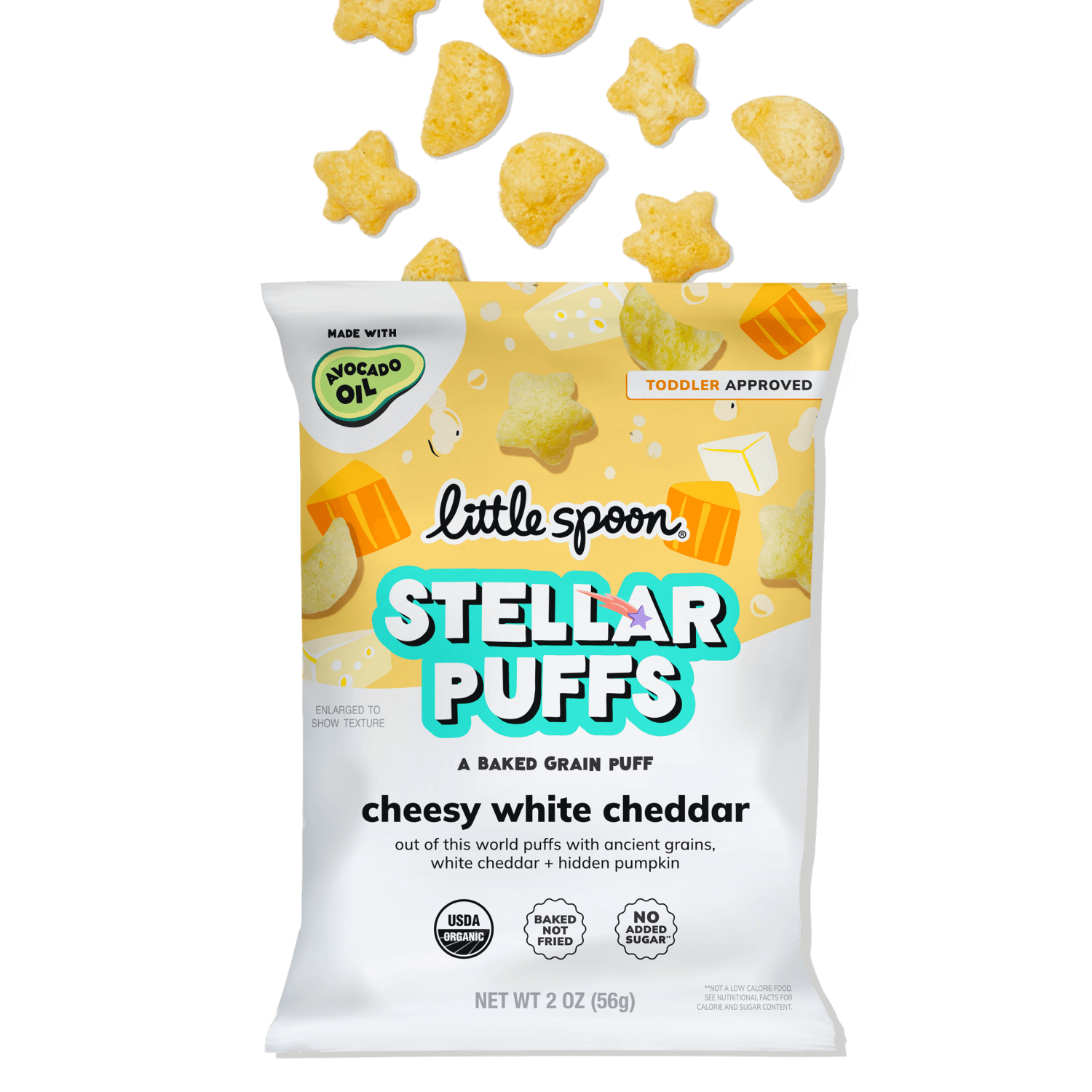 Watch your little cheddar-naut blast off into the Spooni-verse. Made with real white cheddar and pumpkin, this cheesy puff delivers out-of-this-world flavor without any of the bad stuff.