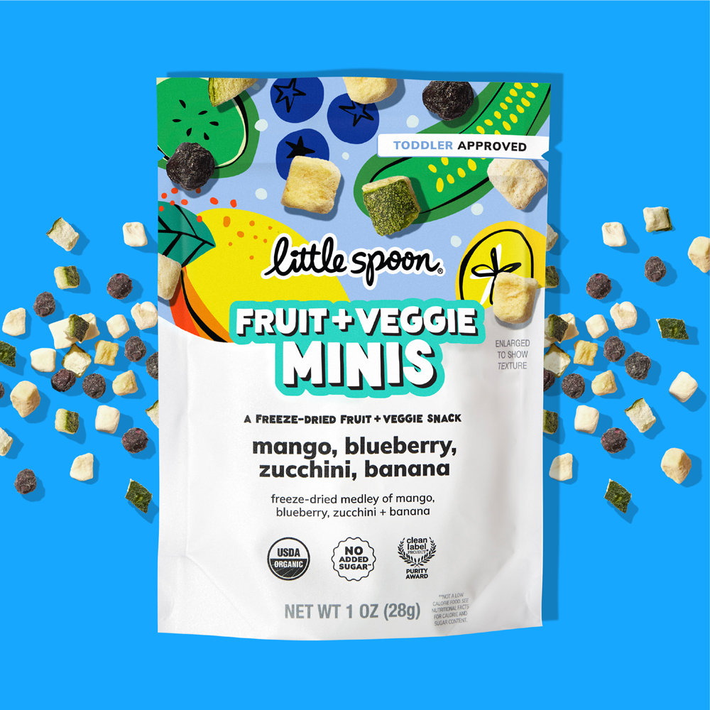 Made with real, organic fruits and veggies. No added sugars, no junk, just whole foods, kept simple. Diced mango, zucchini, banana, and blueberries are gently freeze-dried into pincher-friendly bites that melt like magic. A fruit-and-veggie-packed win!